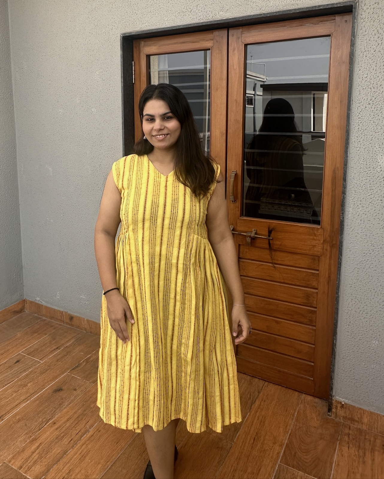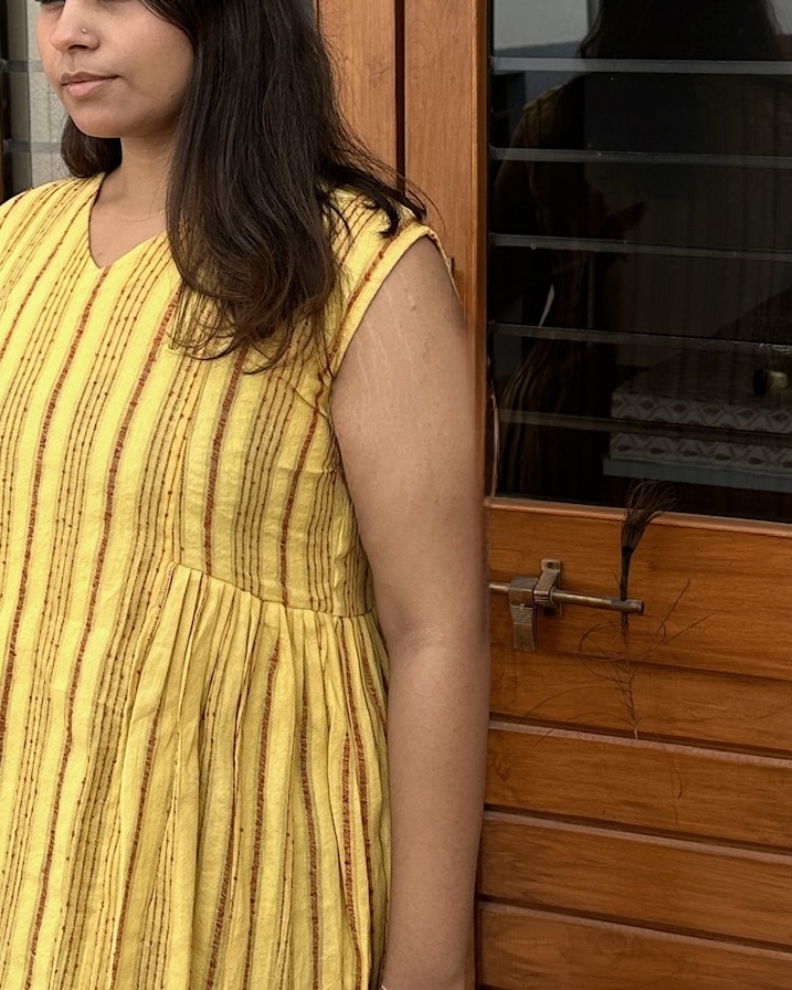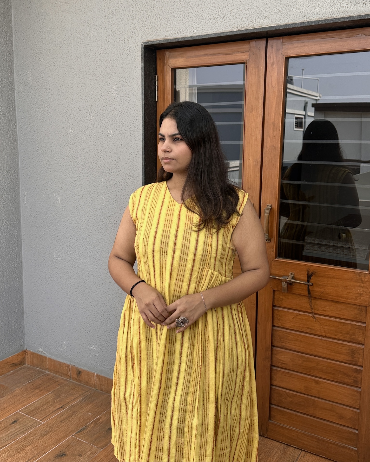 Its gentle gathers and relaxed silhouette create a natural flow, making it an effortless piece for everyday ease. The warm yellow tone carries a quiet glow, while the sleeveless design adds comfort and movement. Rooted in simplicity, Avya feels like lightness draped softly.