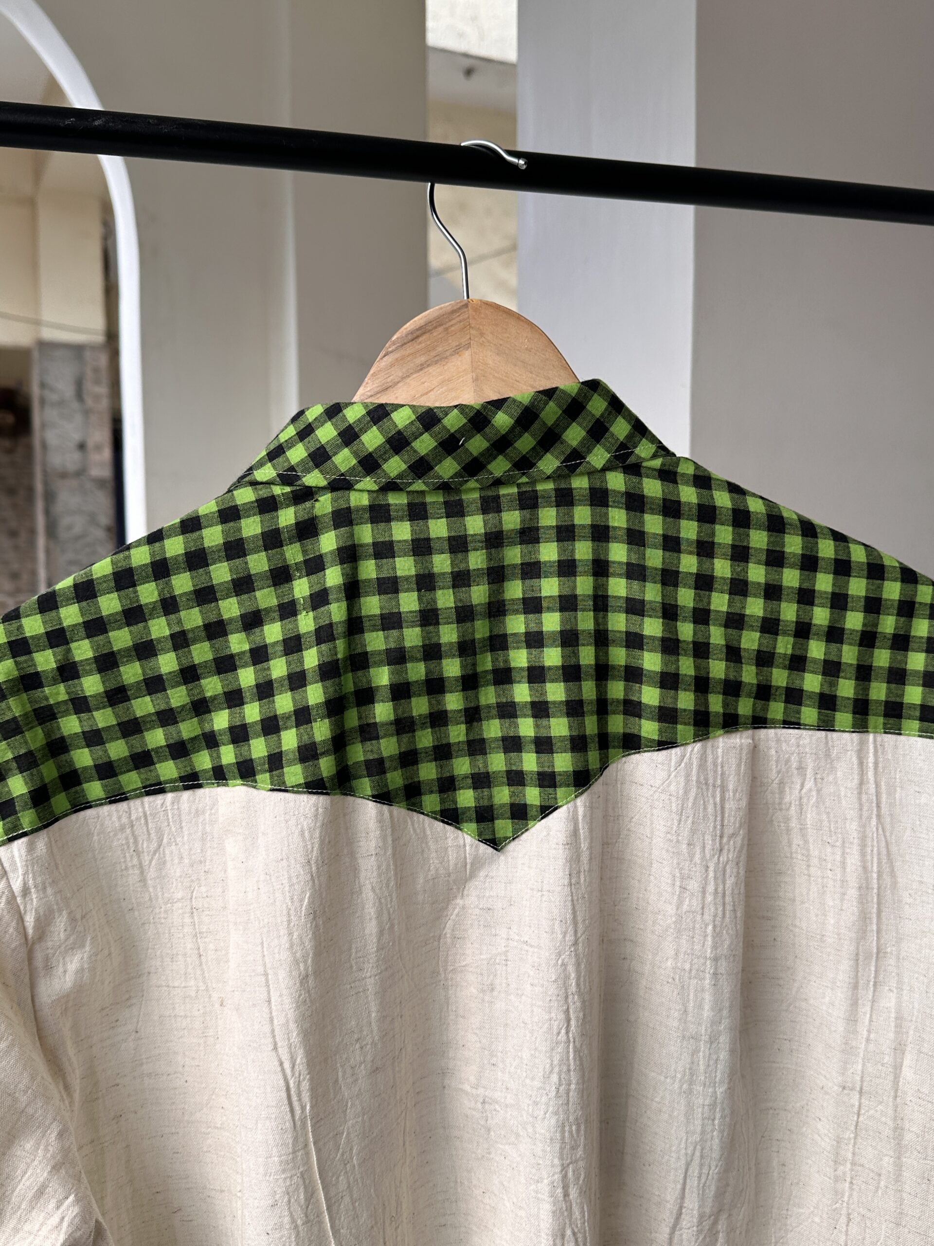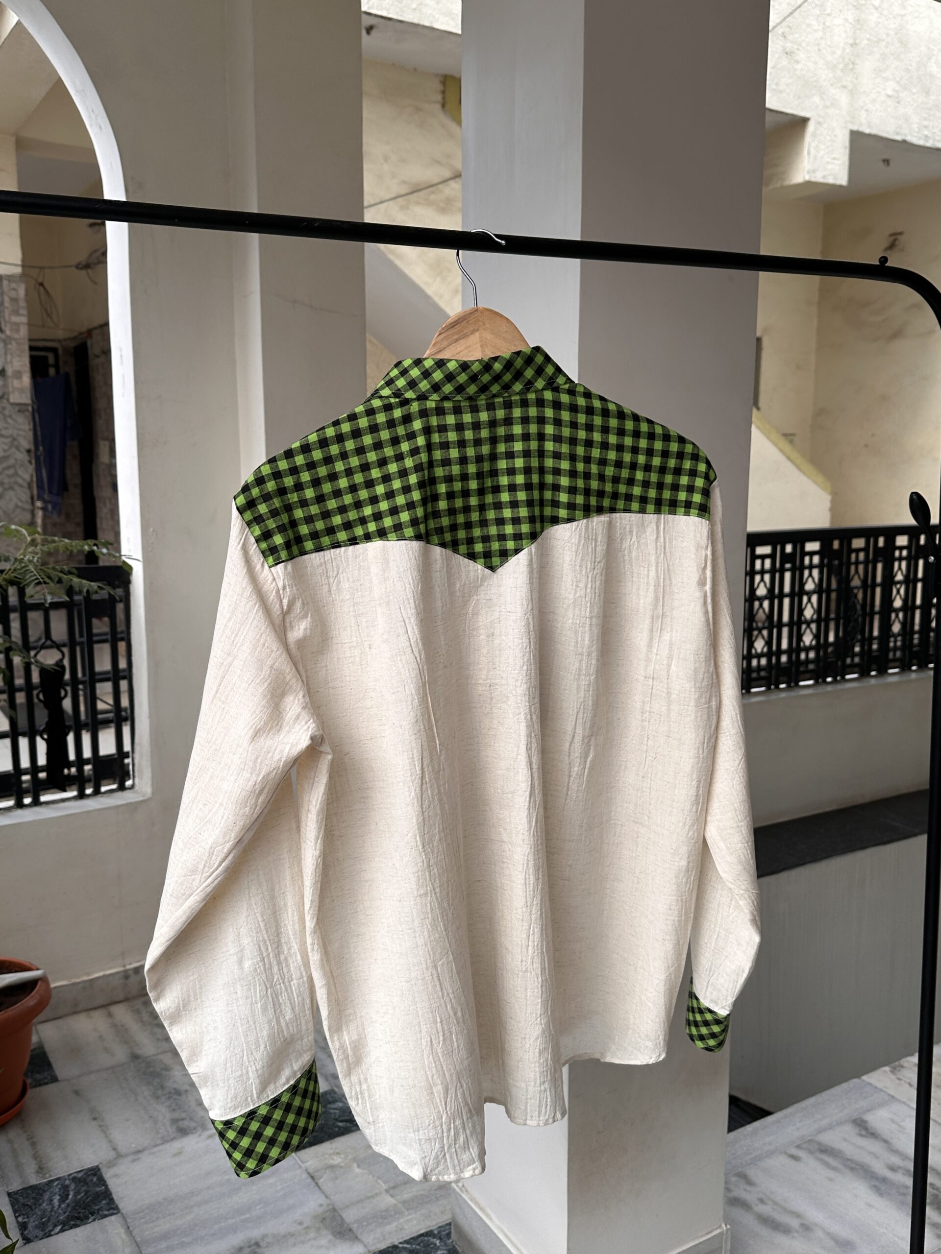 Blending craft with character, the Dāruka shirt pairs raw handwoven cotton with checkered green detailing that adds a modern twist to earthy simplicity. With contrast panels on the collar, placket, cuffs, and yoke, this piece captures an effortless balance of rustic charm and contemporary design.