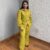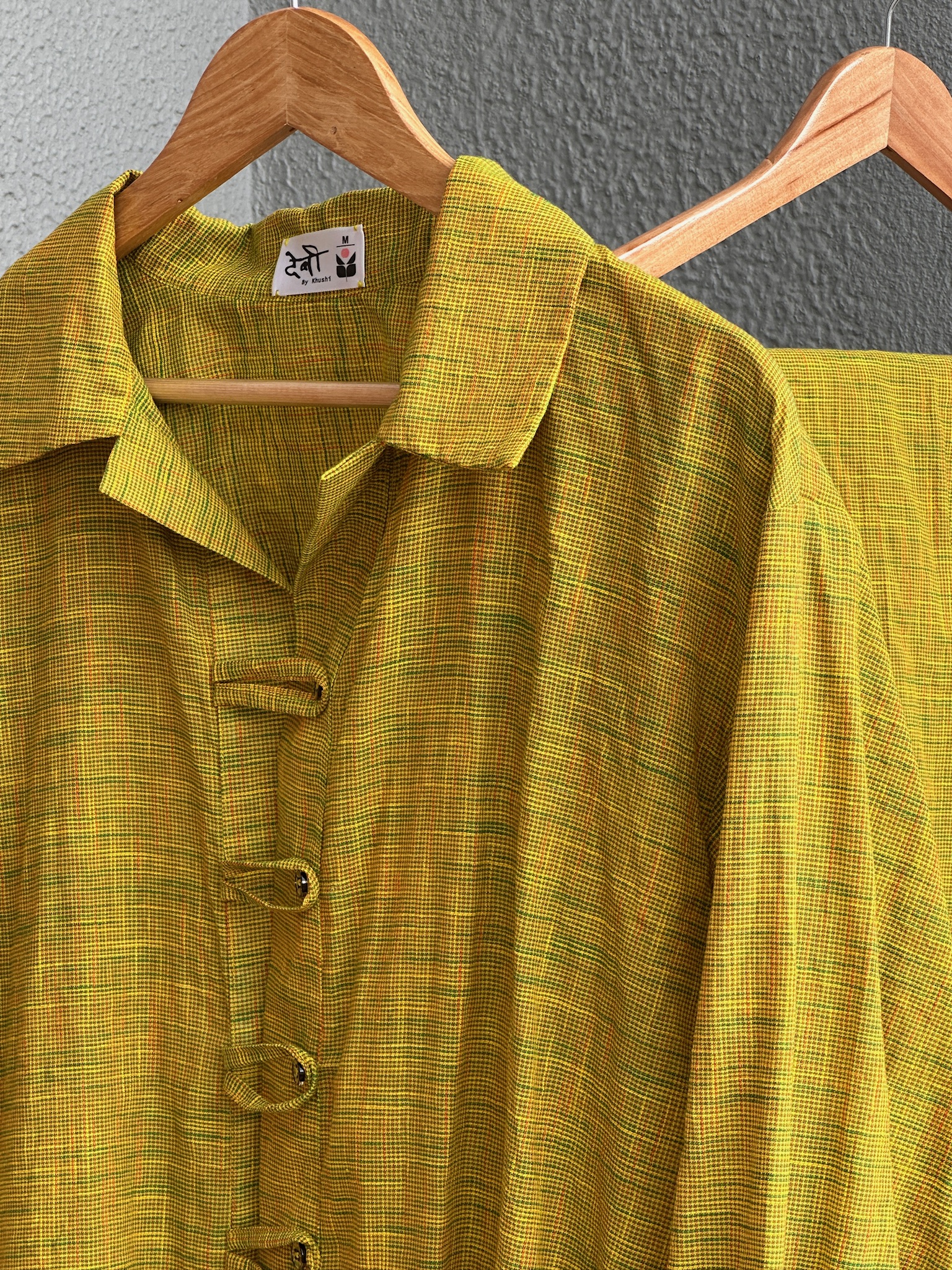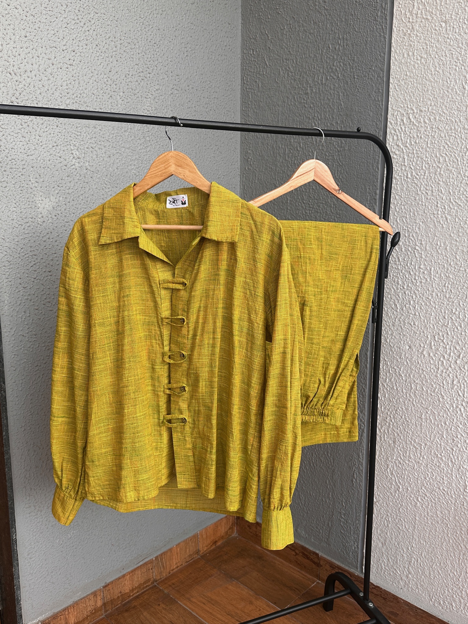 The Haridra Set is a bold yet grounded expression in golden cross-weave cotton. The shirt features a collared neckline with distinctive looped button detailing at the center, paired with full-length sleeves gathered neatly at the cuffs. Wide-leg trousers complete the set, bringing balance and comfort to its structured top. A piece that moves between heritage and modernity, carrying the warmth of turmeric in its weave.