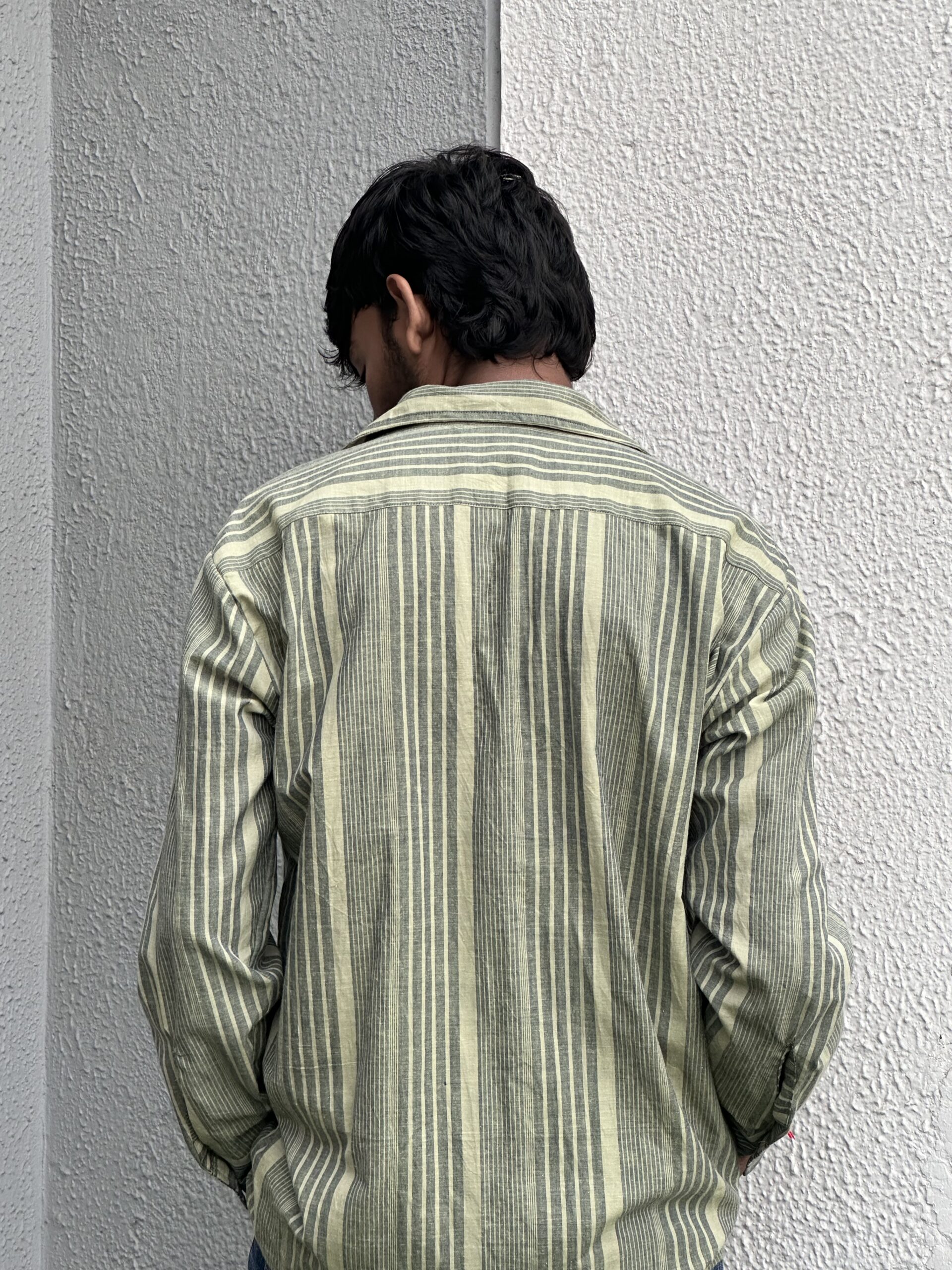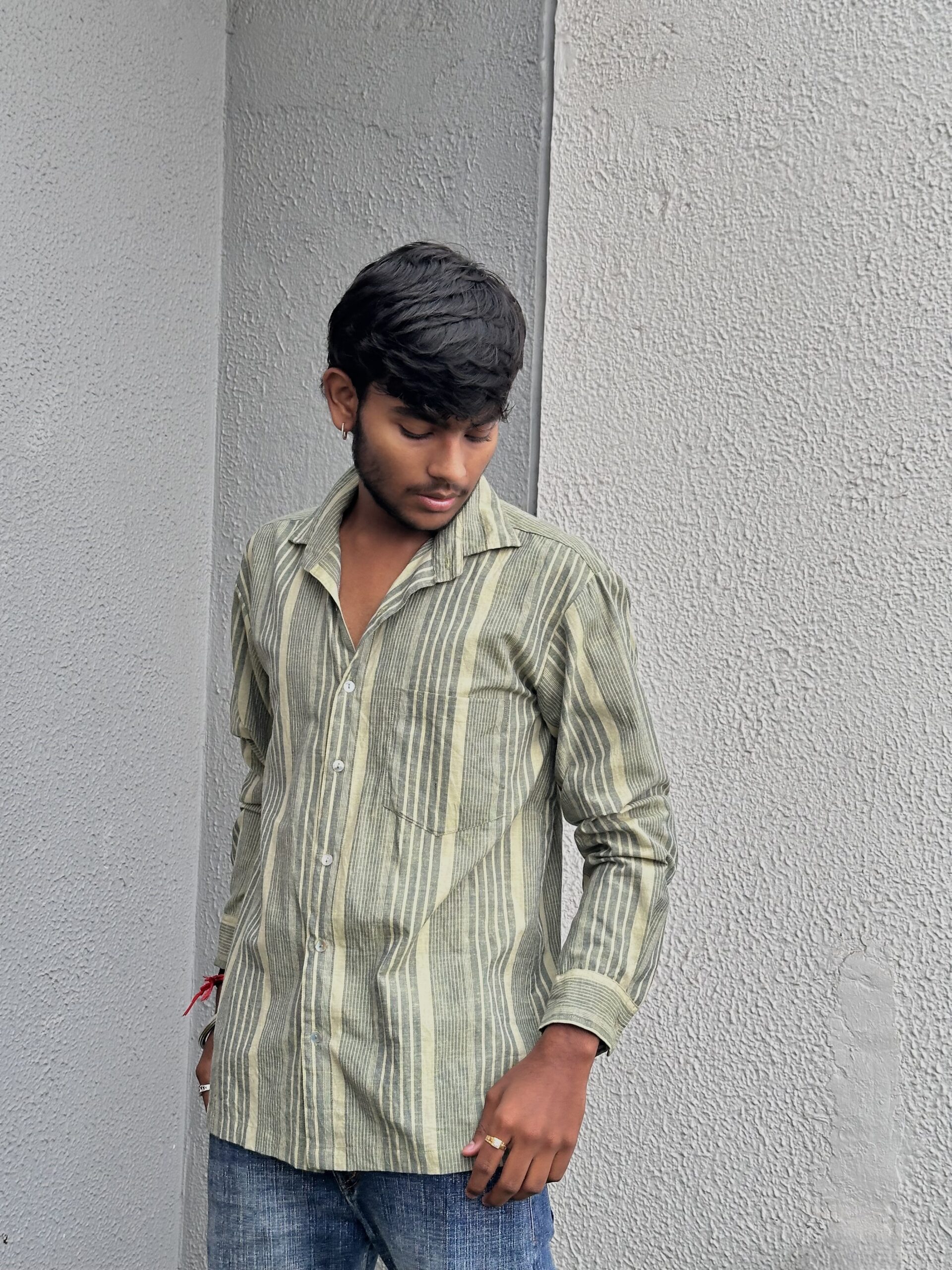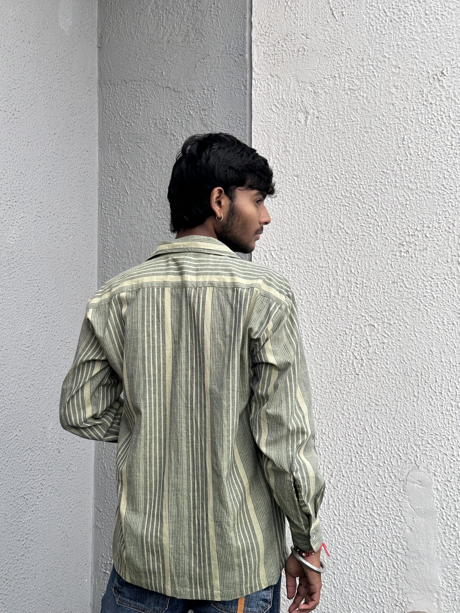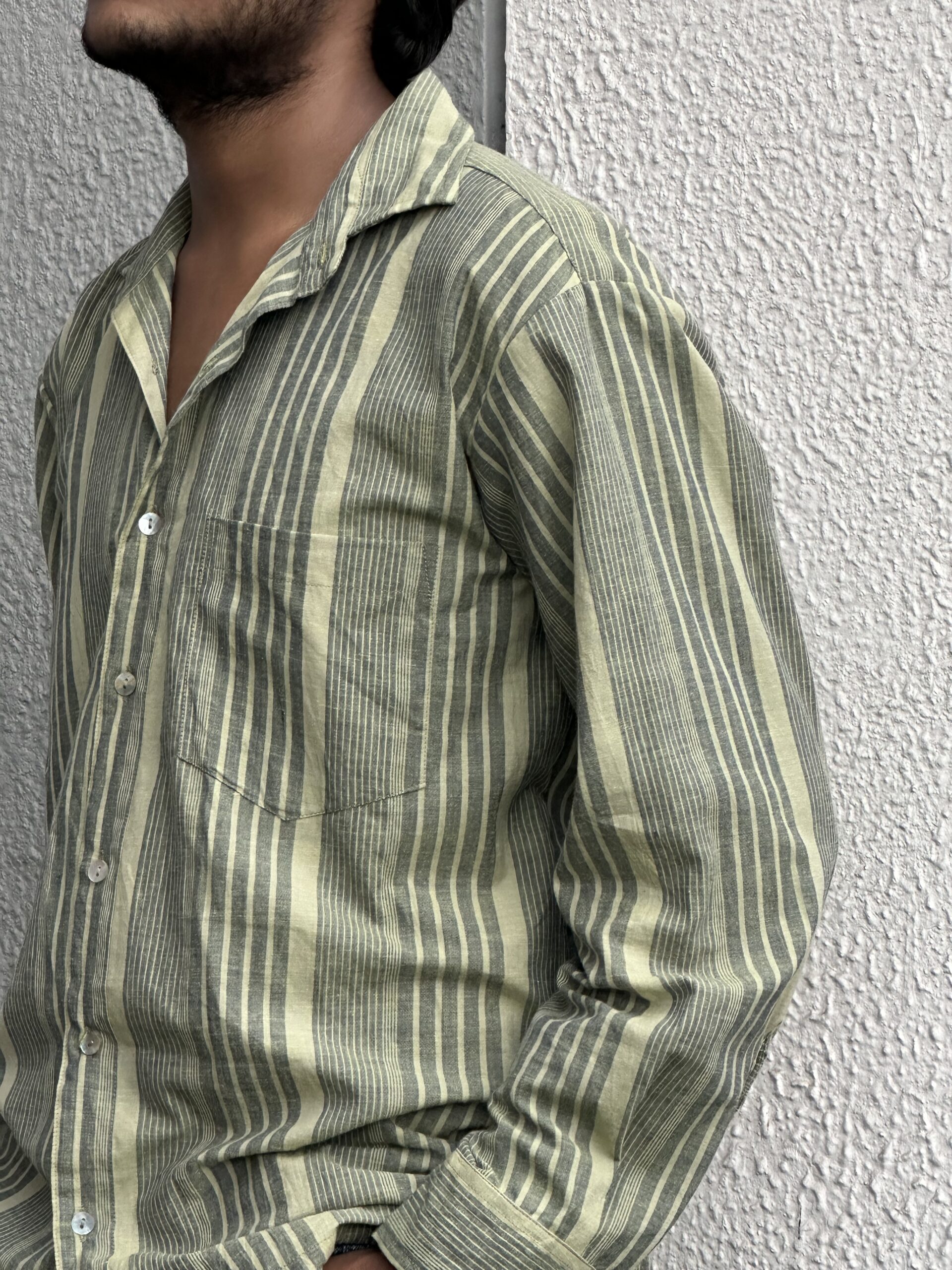 The Harit shirt channels earthy elegance with its muted green tones and vertical stripe design. Lightweight and breathable, it offers a refined yet natural vibe—perfect for effortless day-to-evening transitions.
