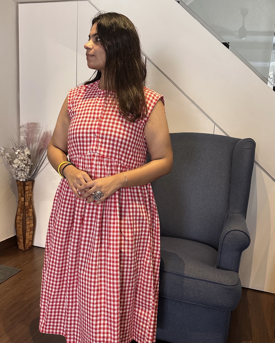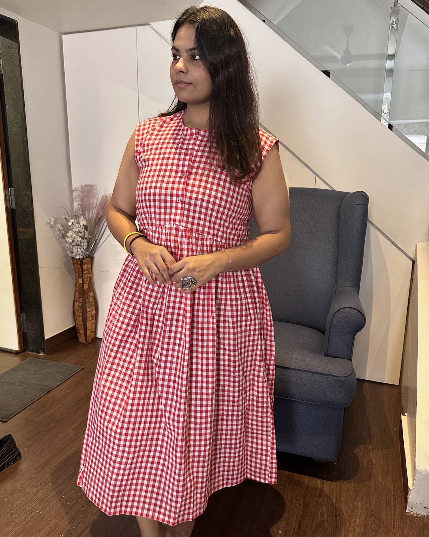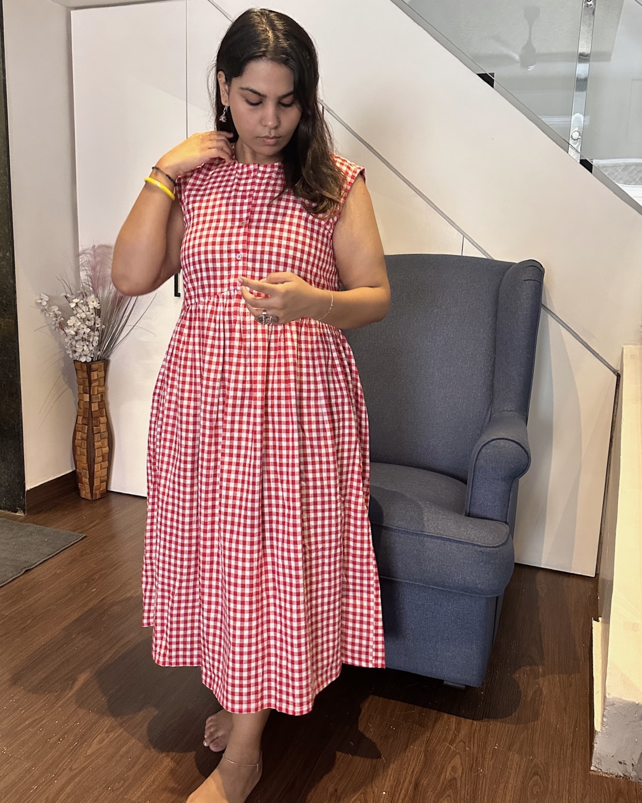 Lal is a breezy gingham midi crafted in a bold red-and-white check, designed for days that call for effortless brightness. With its sleeveless bodice, soft gathers, and easy flow, it brings a playful yet grounded Indian warmth to everyday dressing — simple, joyful, and unmistakably you.