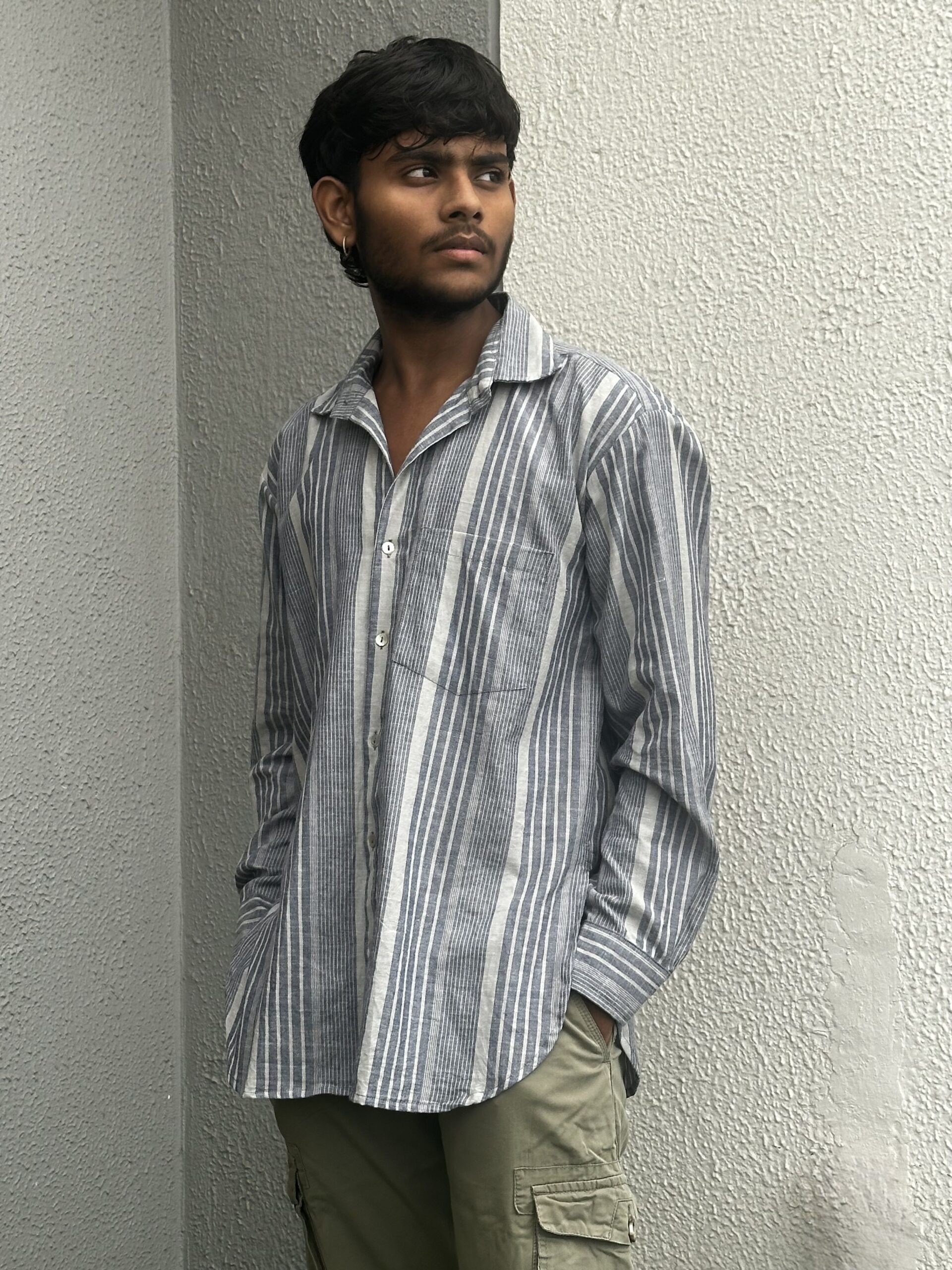 Woven in soft, breathable cotton, this striped shirt carries an ease that moves with you. The clean lines, curved hem, and relaxed fit reflect understated craftsmanship, making it a versatile piece for both everyday wear and quiet moments of pause.