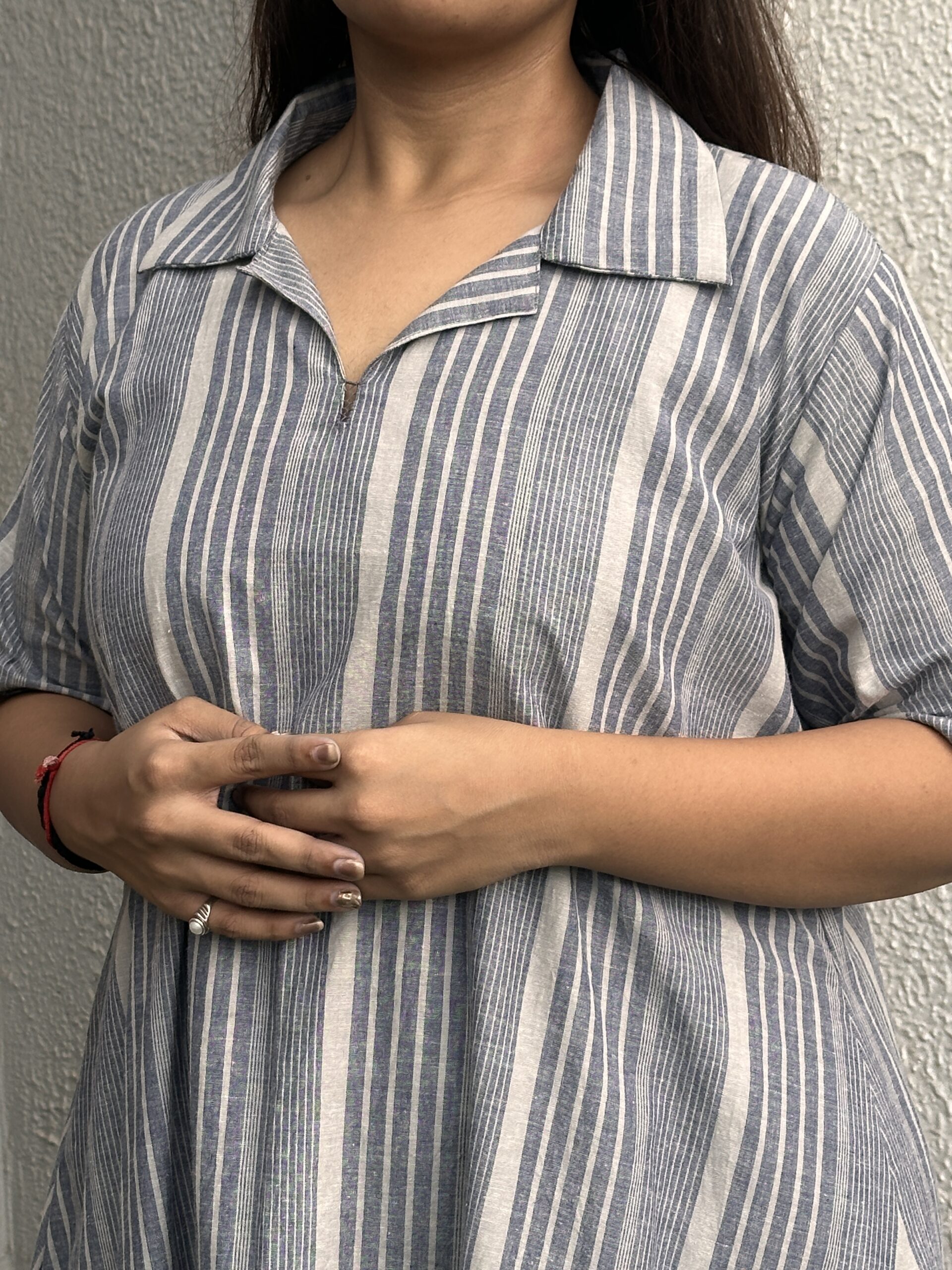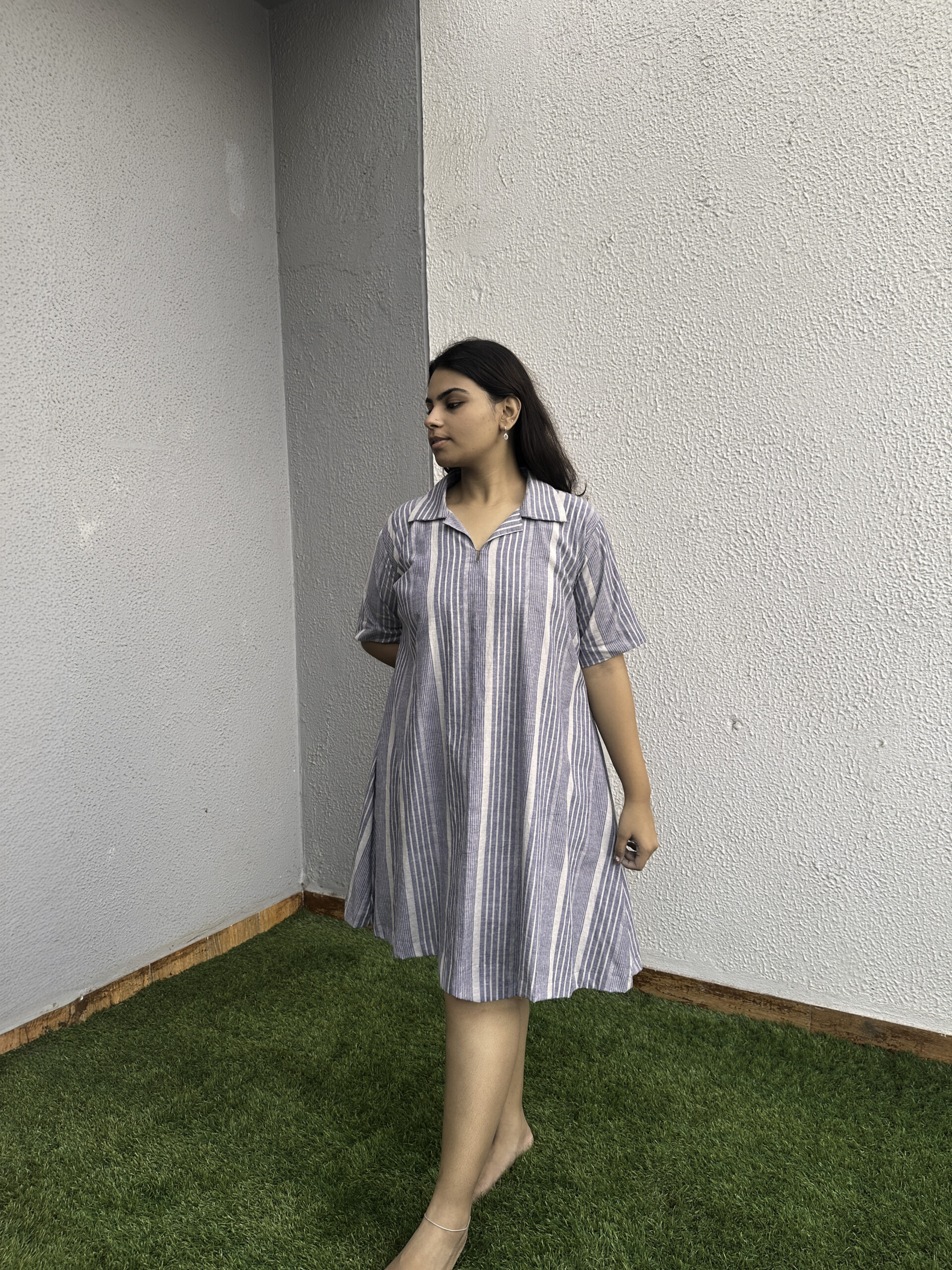 The Niva Dress is designed for everyday ease — with a relaxed A-line flow, collared neckline, and a delicate center-stitched detail that anchors the piece. Its muted blue-grey palette adds a calm versatility, making it as fitting for slow mornings as for effortless evenings.