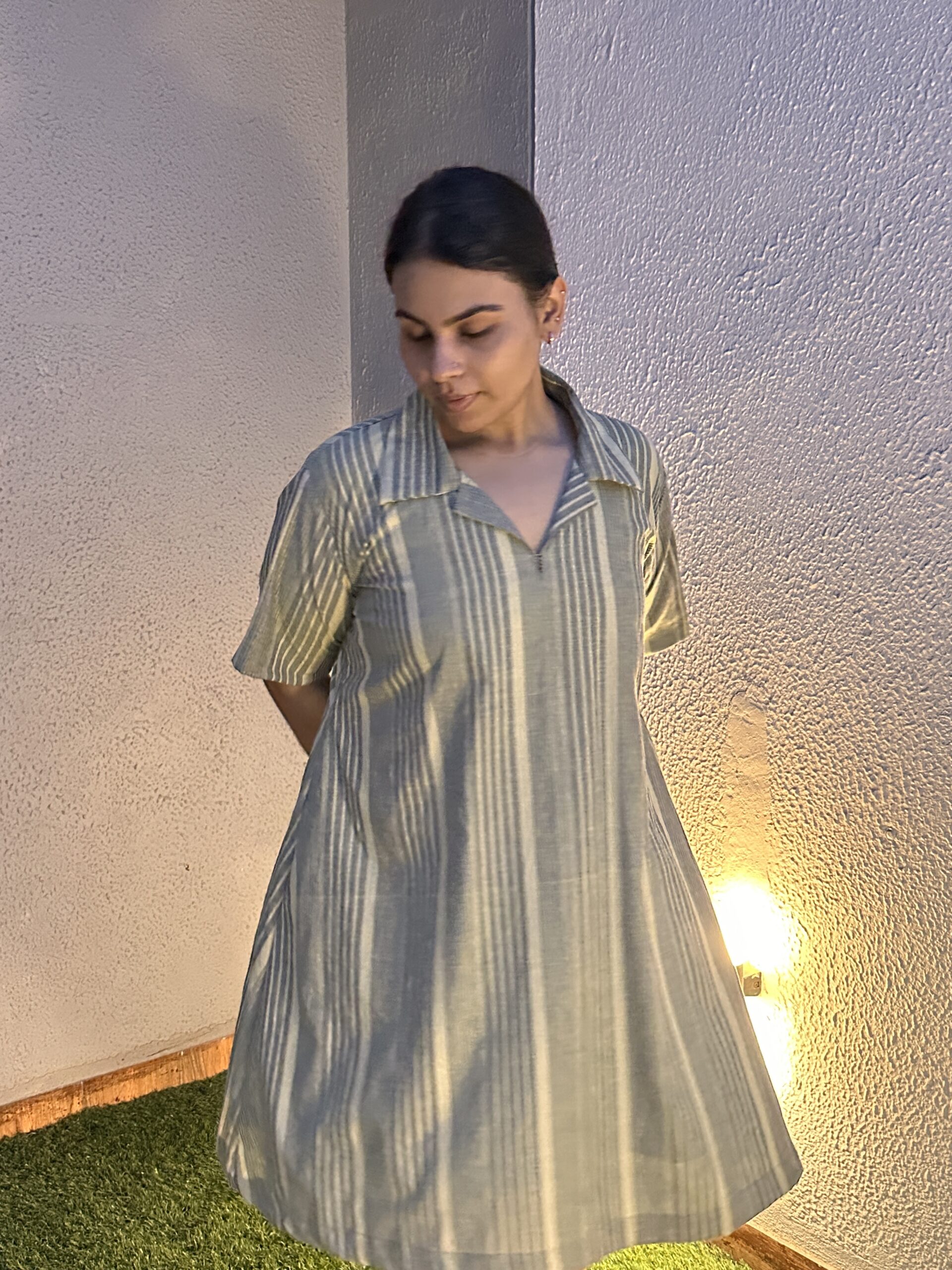 Reva is a striped A-line dress shaped in ease and quiet movement. Its standout feature lies in the neckline — a soft notch framed by a relaxed camp collar, anchored with a delicate hand-stitched centre tack that brings a crafted intimacy to the piece. Vertical stripes lengthen the silhouette before opening into a gentle flare, creating balance between structure and fluidity. Designed for comfort and everyday wear, Reva carries the charm of detail woven into simplicity.