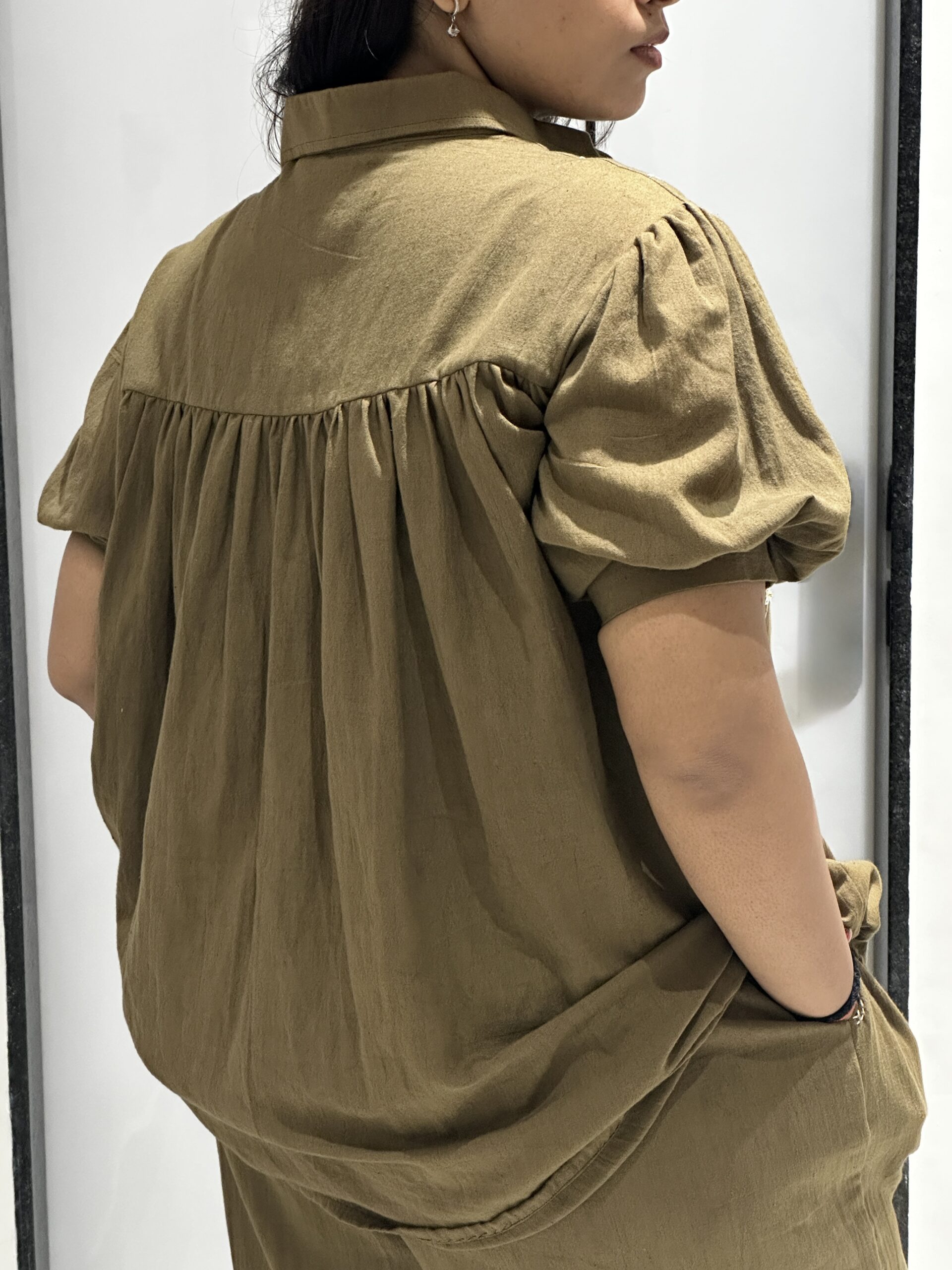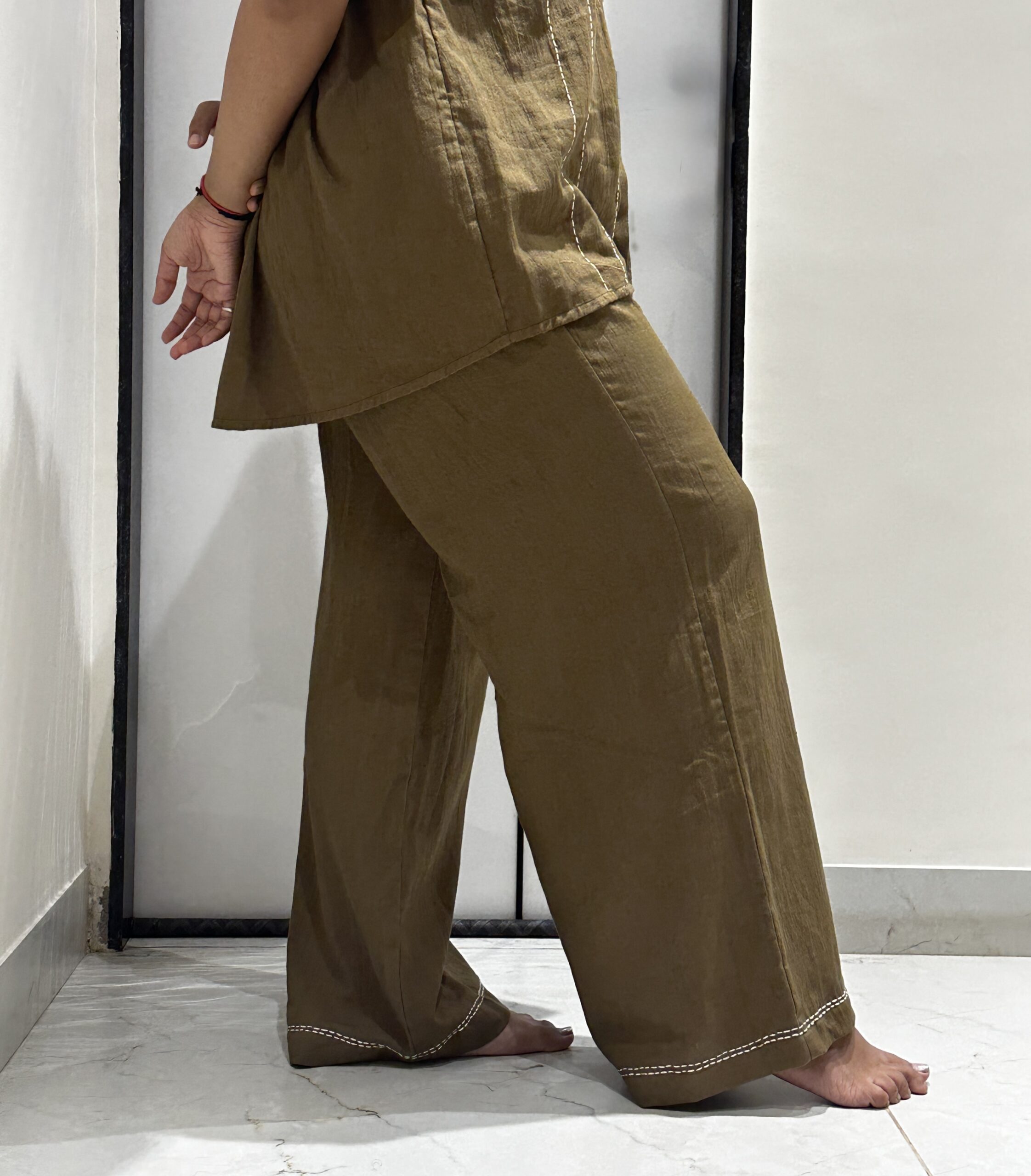 A harmonious set in soft olive cotton, where the shirt flows with gentle gathers and delicate hand-stitched detailing, while the wide-leg trousers move with quiet grace. Crafted for ease, made to feel like second skin — effortless, timeless, and softly expressive.