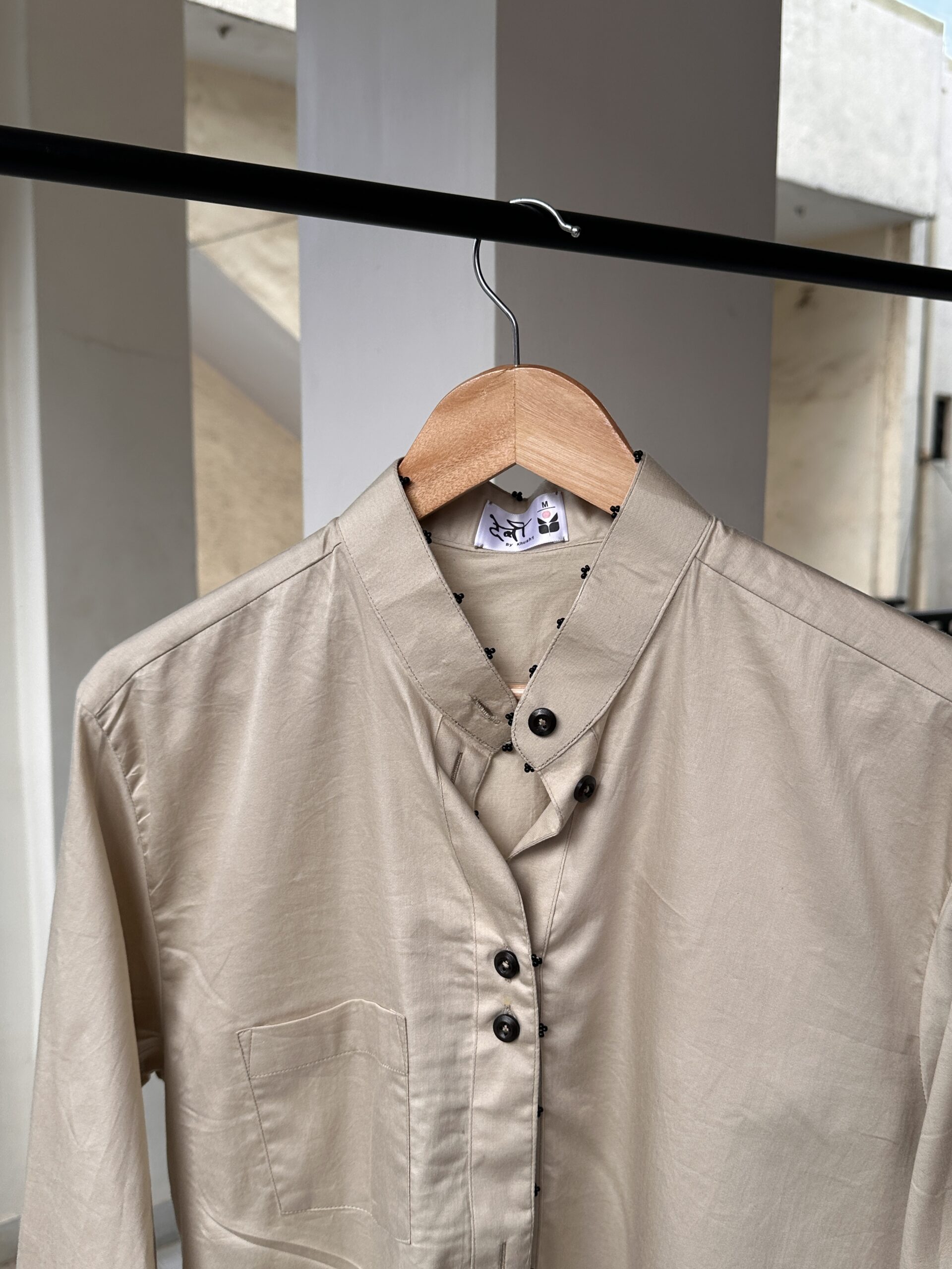The Tārak shirt blends minimalism with depth — a sleek beige base elevated by a distinctive overlapping neckline, contrast-stitched placket, and matte buttons. Its clean lines and soft sheen make it a statement in quiet sophistication.