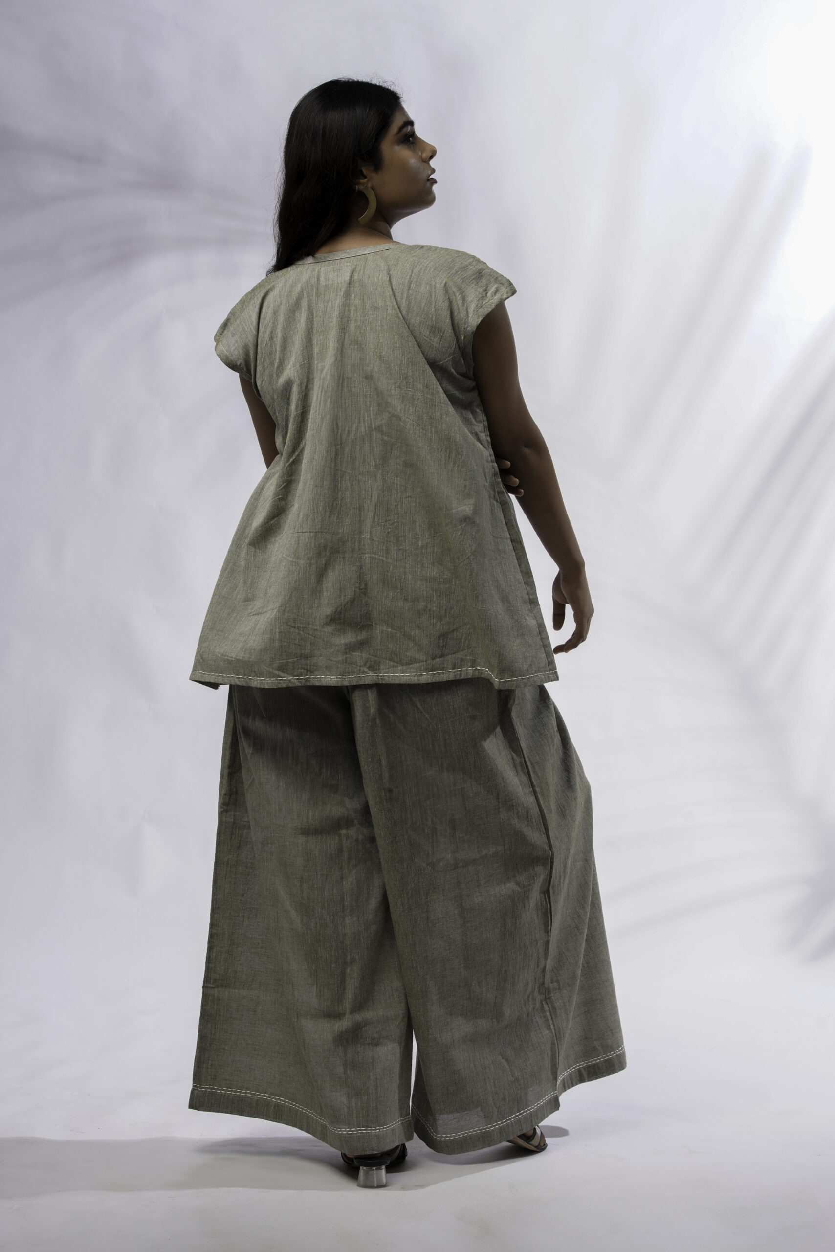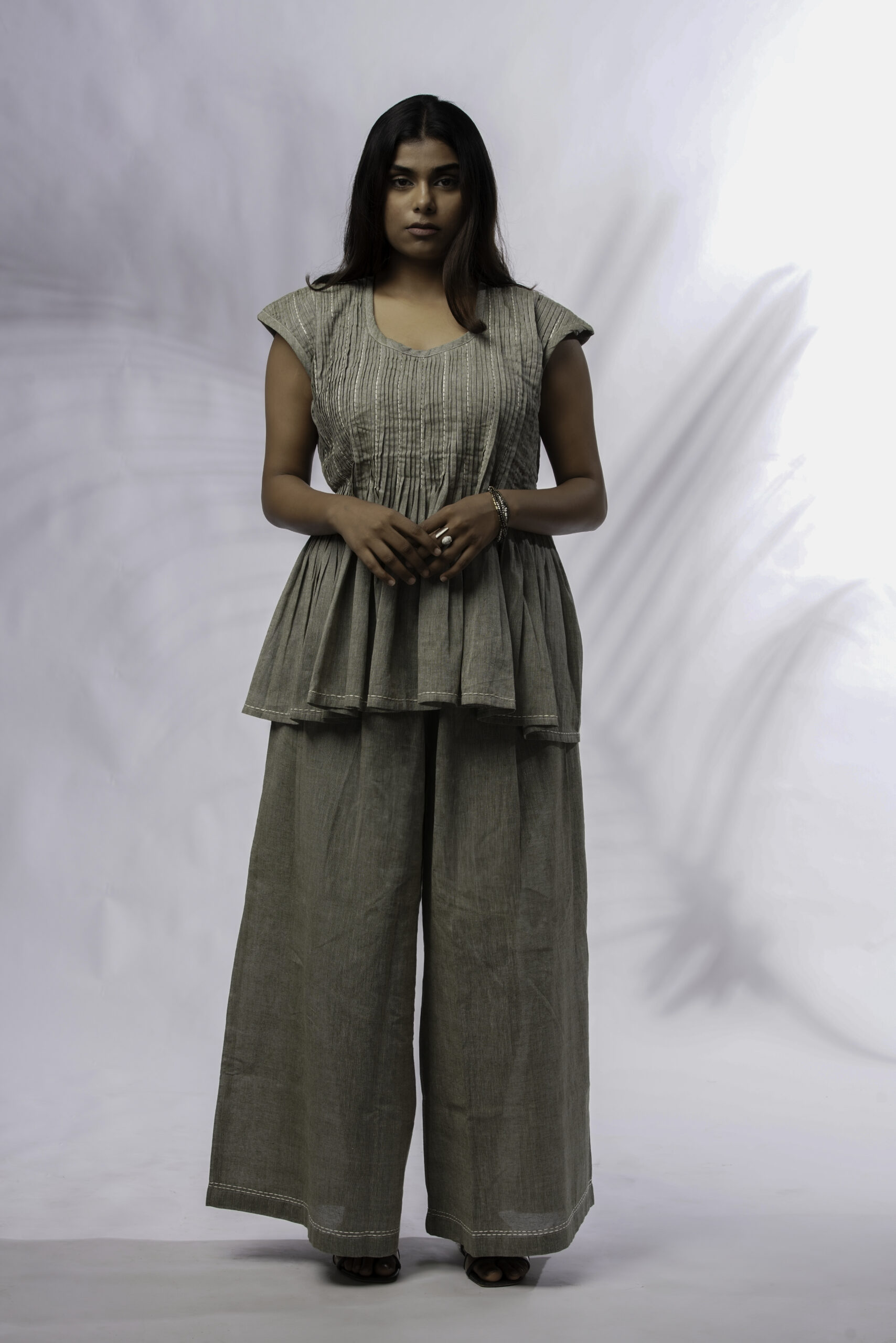Taru is crafted in soft green cotton — a co-ord set shaped by stillness and movement. The sleeveless top features a round neck with gentle front pleating that opens into a soft flare. Paired with wide-leg pants and subtle embroidery, it brings together ease and quiet form in perfect rhythm.