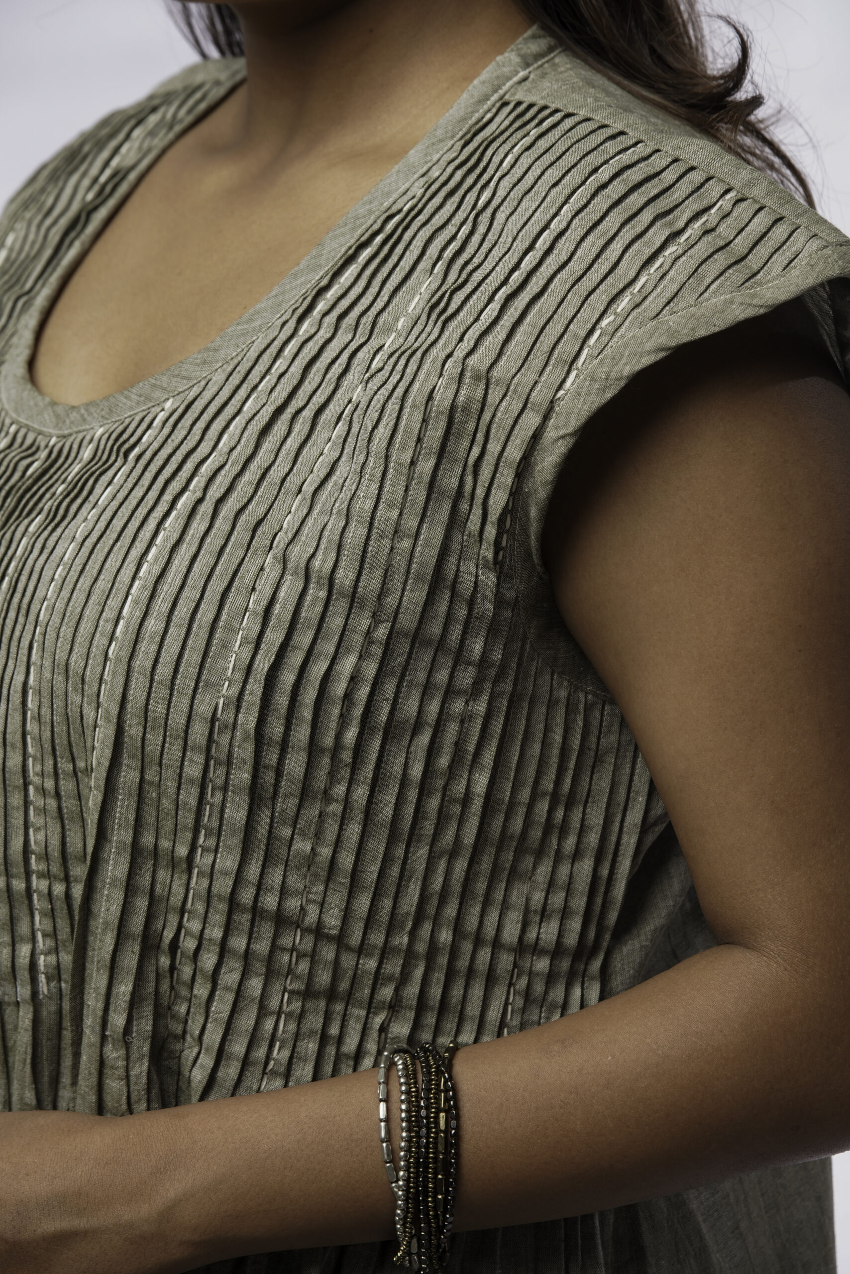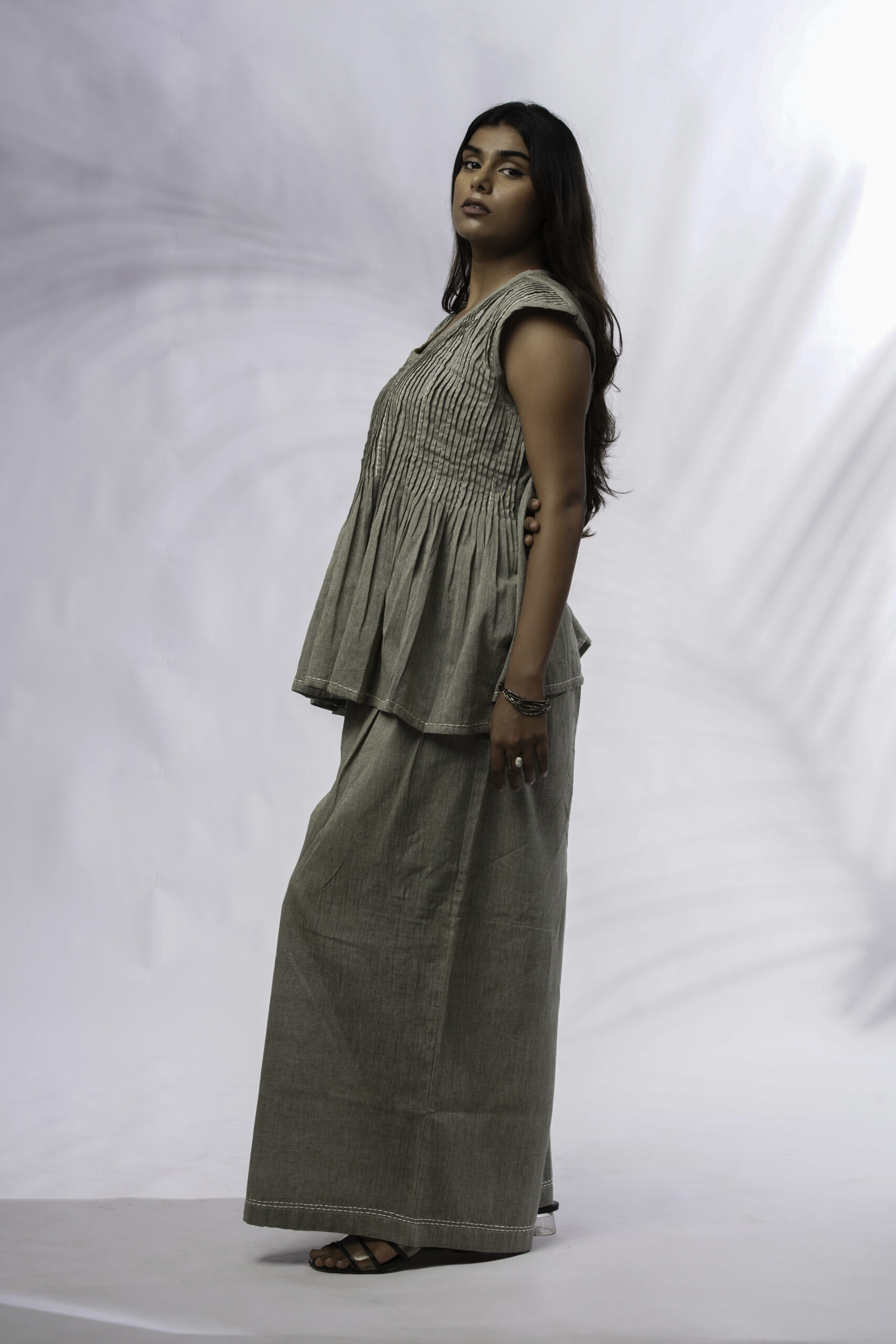 Taru evokes nature, growth, and quiet strength — echoing the green hue and the organic, flowy structure of the pleated yoke. Just like a tree, the garment stands still yet alive, grounded yet free.