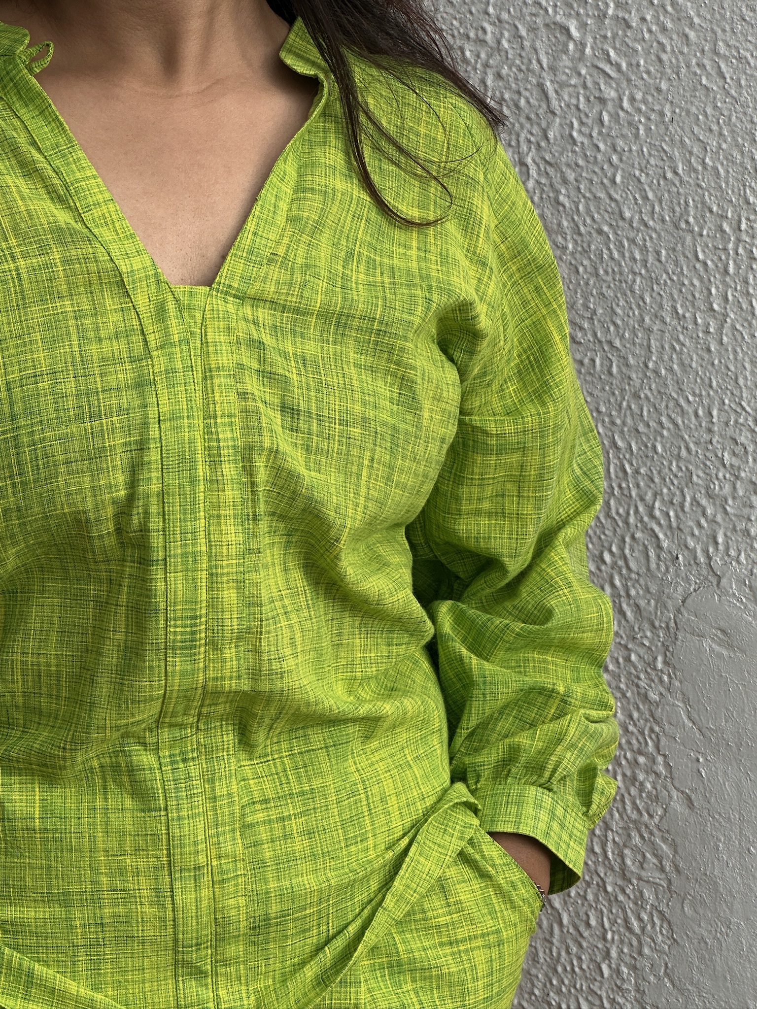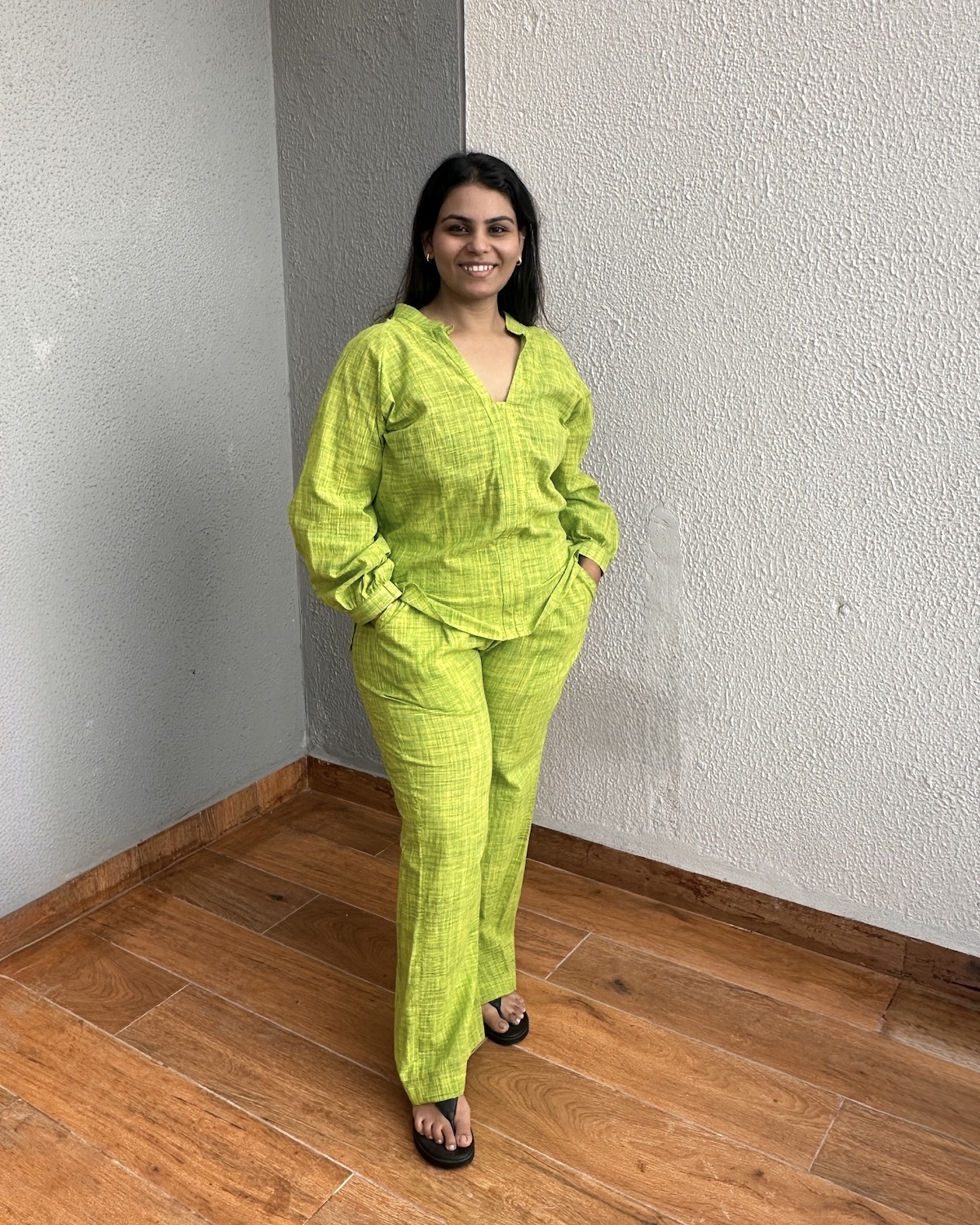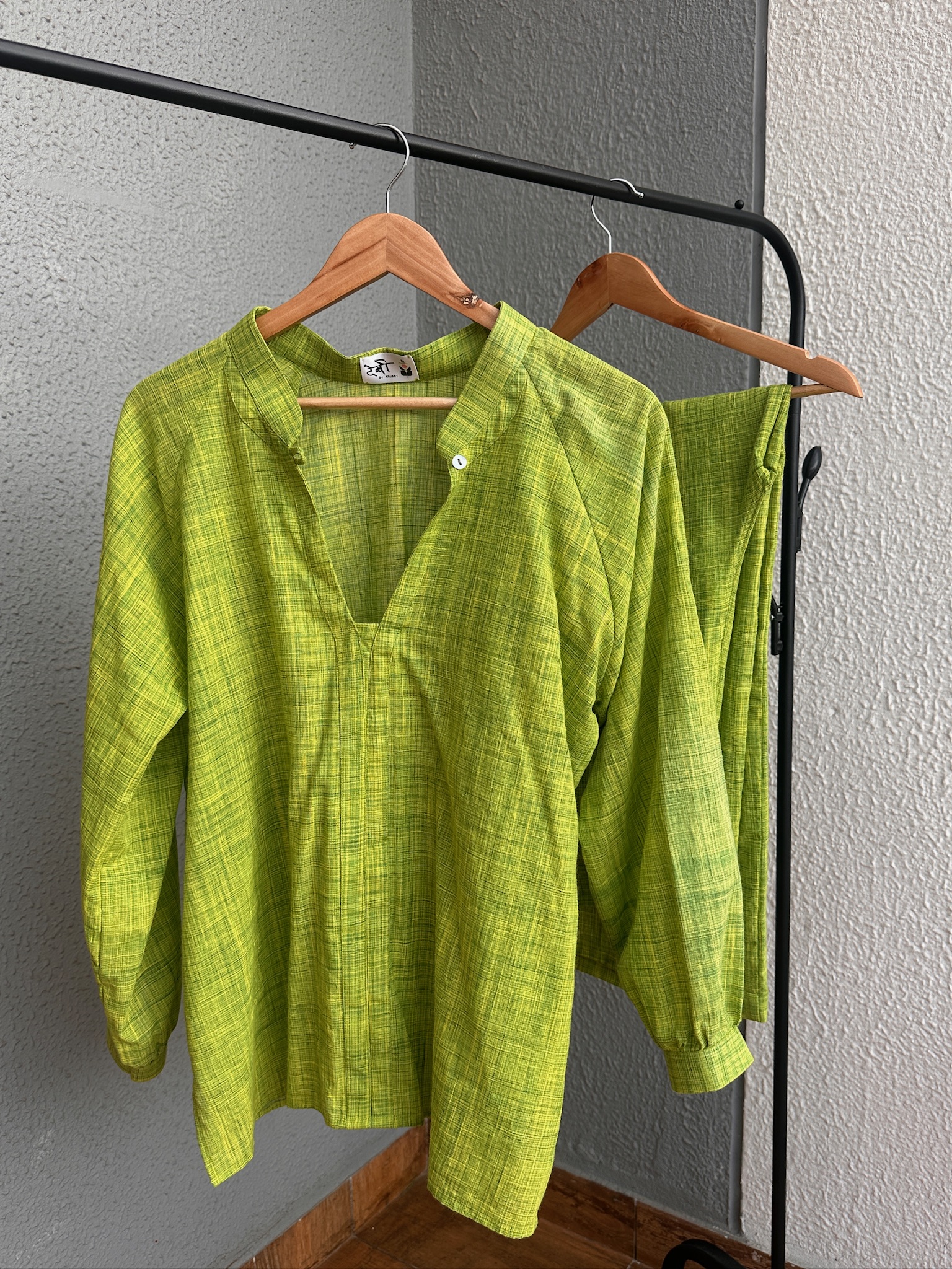 Step into serene comfort with our Vānīra co-ord set, a blend of breathable cotton and timeless design. Dyed in a vivid green inspired by nature’s palette, the airy kurta with its open neckline pairs seamlessly with straight-fit trousers, offering a look that’s as effortless as it is graceful.